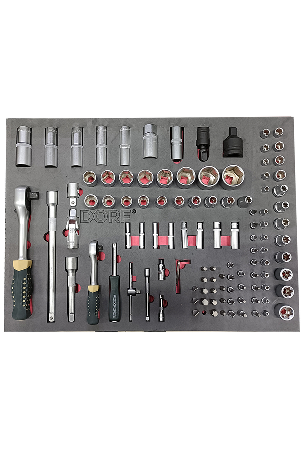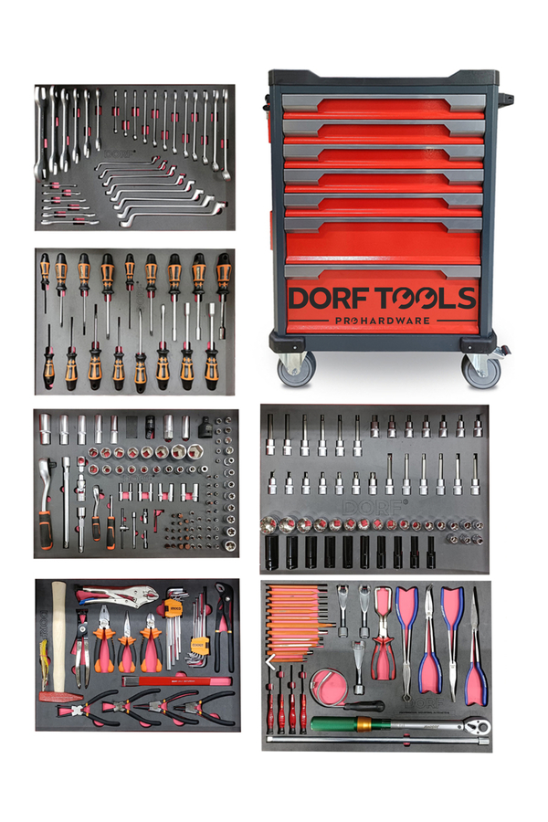 Dorf 272 Parça Dolu Takım Arabası, sanayi, oto servis, bakım-onarım atölyeleri ve profesyonel kullanım için özel olarak tasarlanmış güçlü ve kapsamlı bir araç setidir. 7 adet geniş çekmecesi sayesinde tüm el aletlerini düzenli ve erişilebilir şekilde saklama imkânı sunar. İçerisinde bulunan 272 parça kaliteli el aletiyle tam donanımlı bir iş istasyonu sunar.
