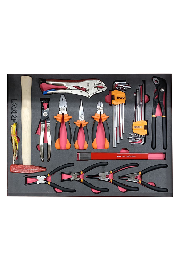 Set içeriğinde; 500 gr çekiç, 250 mm ayarlı pense, 250 mm papağan pense, 240 mm yassı düz keski, 4 adet segman pensesi (180 mm), 9 parça alyan seti, 9 parça torx seti, oto kontrol kalemi, hortum kelepçe pensesi, 180 mm retta pense, 160 mm retta kargaburun ve 160 mm retta yan keski yer alır. Bu geniş içerik, hem otomotiv sektöründe hem de genel tamir, montaj ve bakım işlerinde yüksek verimlilik sağlar.