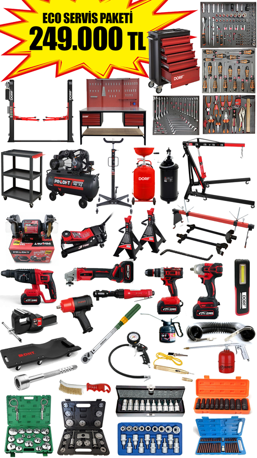 Dorf Eco Full Oto Servis Kurulum Paketi, profesyonel düzeyde oto servis açmak veya mevcut servisini modernize etmek isteyenler için tasarlanmıştır. Paket içerisinde lift, kompresör, takım arabası, taşıma arabası, tezgah ve daha birçok üst düzey ekipman yer alır.