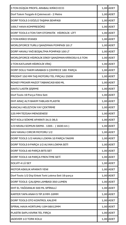 3 TON DÜŞÜK PROFİL ARABALI KRİKO Eco 1,00 ADET Dorf Takım Tezgahı 6 Çekmeceli - 2 Metre 1,00 ADET DORF TOOLS 3 GÖZLÜ TAŞIMA SEHPASI 1,00 ADET 100LT HAVA KOMPRESÖRÜ 1,00 ADET DORF TOOLS 4 TON TAM OTOMATİK HİDROLİK LİFT 1,00 ADET 3 TON KRİKO STANDI 1,00 ADET WORLDFORCE TURLU ŞANZIMAN POMPASI 18 LT 1,00 ADET DORF HAVALI YAĞ BOŞALTMA POMPASI 100 LT 1,00 ADET WORLDFORCE HİDROLİK DİKEY ŞANZIMAN KRİKOSU 0,5 TON 1,00 ADET 2 TON KATLANIR HİDROLİK VİNÇ 1,00 ADET DORF DOLU TAKIM ARABASI 5 ÇEKMECE 180 PARÇA 1,00 ADET PRODHT 150 MM TAŞ MOTORU TEL FIRÇALI 250W 1,00 ADET RONEY PROAİR MAZOT TABANCASI 600 ML 1,00 ADET SAATLİ LASTİK ŞİŞRME 1,00 ADET Dorf Tools 19 Parça Filtre Seti 1,00 ADET DHT ARAÇ ALTI BAKIM TABLASI PLASTİK 1,00 ADET KANCALI HELEZYON YAY ÇEKTİRME 1,00 ADET 125 MM TEZGAH MENGENESİ 1,00 ADET ROT KOLU SÖKME APARATI 34,5-39,5 1,00 ADET 1/2 HAVALI SOMUN SIKMA - 1305 - ( 1630 nm ) 1,00 ADET GAV HAVALI CIRCIR MOTORU 1/2 1,00 ADET DORF TOOLS 1/2 HAVALI LOKMA 10 PARÇA TAKIMI 1,00 ADET DORF TOOLS 9 PARÇA 1/2 ALYAN LOKMA SETİ 1,00 ADET DORF TOOLS 40 PARÇA BITS SET 1,00 ADET DORF TOOLS 18 PARÇA FREN İTME SETİ 1,00 ADET SOLVİT 4 LÜ SET 1,00 ADET MOTOR ASKILIK APARATI YENİ 1,00 ADET Dorf Tools 1/2 Dişi Erkek Tork Lokma Seti 19 parça 1,00 ADET DORF TOOLS ÇALIŞMA LAMBASI 350 LUMEN 1,00 ADET DHT EL YAĞDANLIK 500 ML SPİRALLİ 1,00 ADET KARTER TAPA ANAH S TİP.8 MM-10MM 1,00 ADET DORF TOOLS OTO KONTROL KALEMİ 1,00 ADET SPİRAL HAVA HORTUMU 15M 08X12MM 1,00 ADET PLASTİK SAPLI KIVRIK TEL FIRÇA 1,00 ADET JADEVER 1/2 TORK KOLU 1,00 ADET