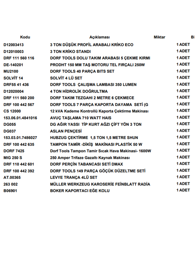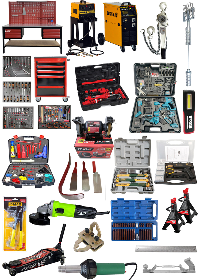 DORF Kaporta Servis Kurulum Paketi Full Set, oto kaporta ve genel servis atölyesi açmak veya mevcut servis ekipmanlarını profesyonel seviyeye yükseltmek için tasarlanmış tam donanımlı ekipman paketidir. Paket, servisinizde birçok farklı bakım, onarım ve kaporta işini yapabilmeniz için gerekli alet ve cihazları bir arada sunar.