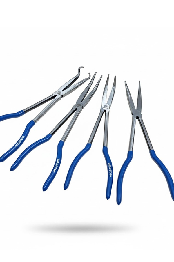 WADFOW WPS0644 seti, otomotiv tamirinden makine bakımına, dar ve ulaşılması zor alanlarda maksimum kontrol ve hassasiyet sağlamak üzere tasarlanmış dört temel uzun burunlu pensemeyi bir araya getirir. Her bir pense, zorlu işler için 280mm (11 inç) ekstra uzunluğa sahiptir.