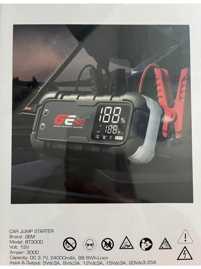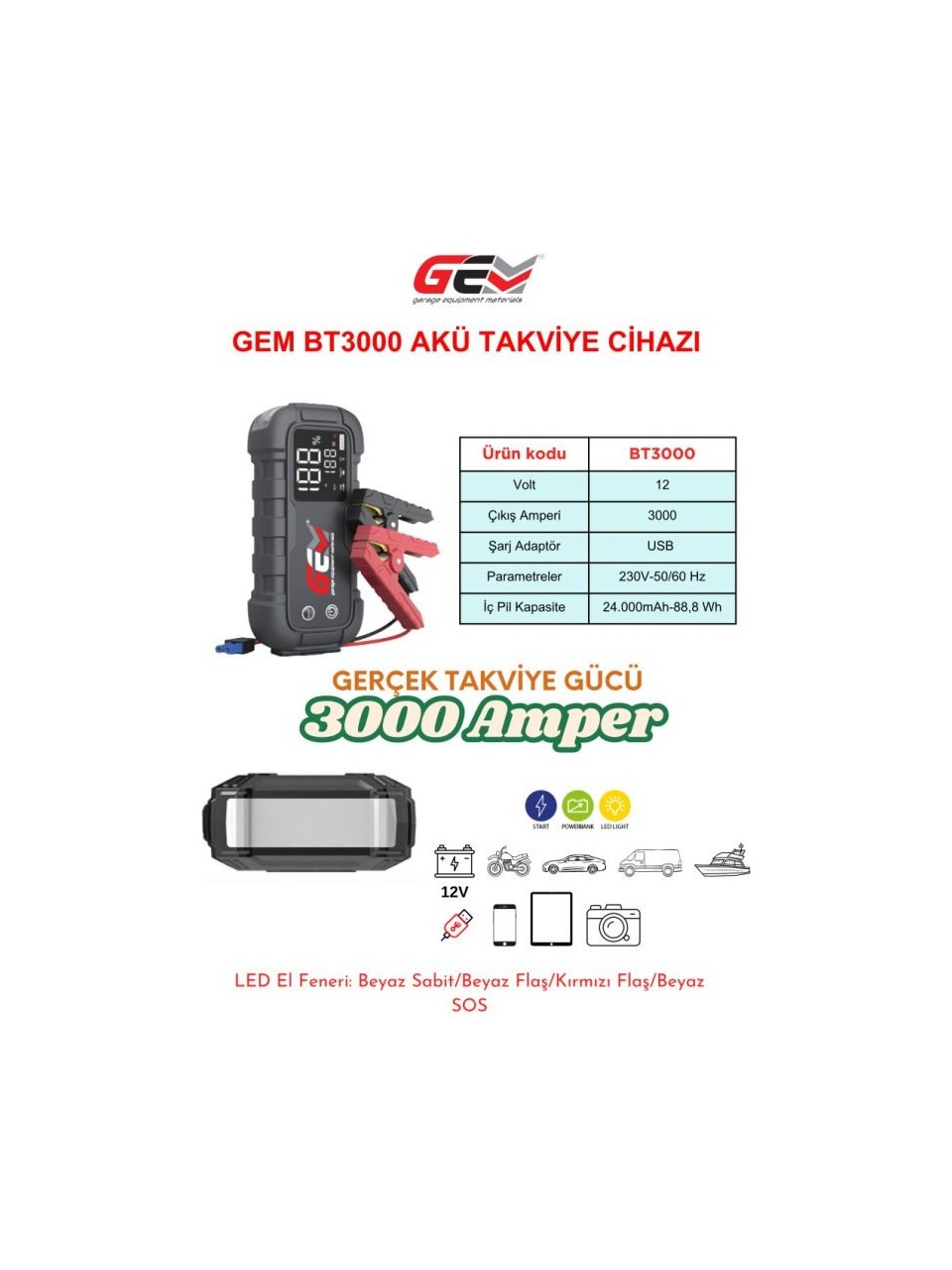 GEM BT3000 AKÜ TAKVİYE CİHAZI Powerbank + Led Lamba • Tüm 12 Volt akülü araçlarda 3000 Amperlik anlık başlangıç akımı ile Otomobil, Motosiklet, ATV, Tekne, Traktör, Çim Biçme, Karavan daha birçok aracın motorunu anında çalıştırır. • GEM BT3000 Akü takviye cihazımızı tüm akü tipleri için güvenle kullanabilirsiniz. Cihazımızda ters polarite koruması, aşırı pil ısınma için koruma vb.. gibi bir çok cihaz ve takviye yapılan araç için koruma fonksiyonu mevcuttur. • Gem BT3000 Akü takviye cihazı ile 10.000 cc’ye kadar benzinli motorları, 8.000 cc’ye kadar dizel motorlu araçlara takviye yapabilirsiniz. • Ürünümüzde 3 Adet USB Port (5V/3A, 9V/2A, 12V/1.5A) ve 1 Adet DC Port (15vdc 10A) bulunmaktadır. Tablet, Telefon vb. gibi bir çok elektronik ürününüzü şarj edebilirsiniz. • Ayrıca BT3000 Akü Takviye Cihazımızda Led Flash ışığı (3 farklı mod) ve acil durumlar için SOS Işık modu bulunmaktadır.