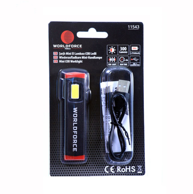 Worldforce Şarjlı Mini El Lambası COB Ledli 300 Lümen (Model: 11543), kompakt yapısı ve yüksek ışık gücüyle ideal bir aydınlatma çözümüdür.